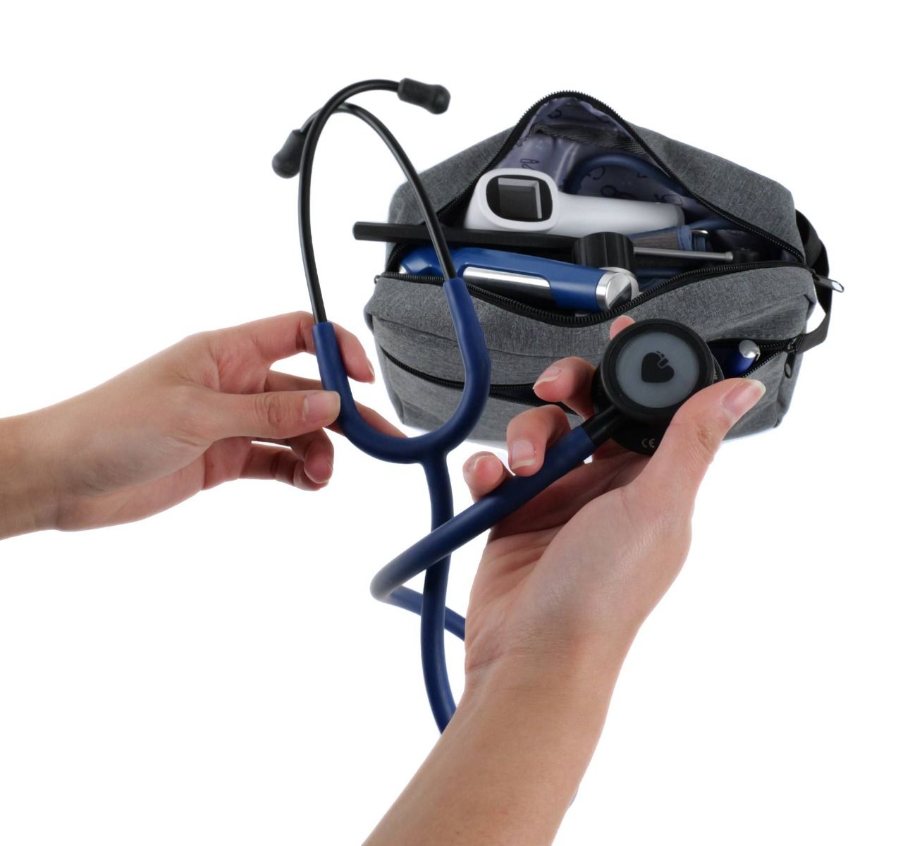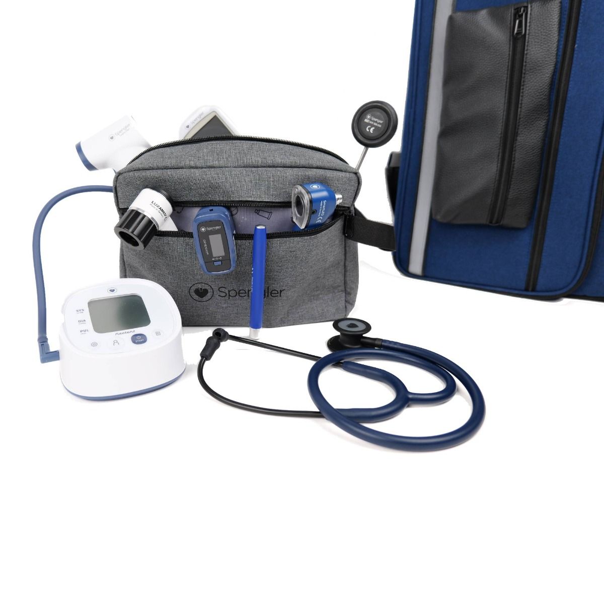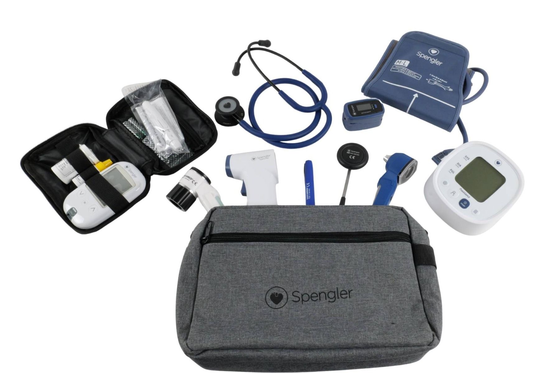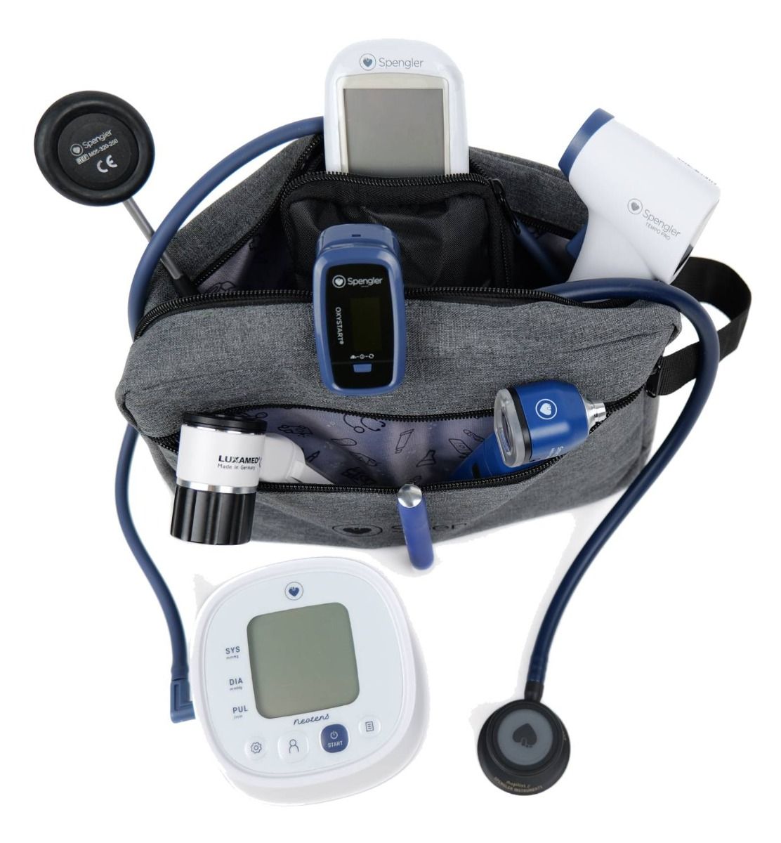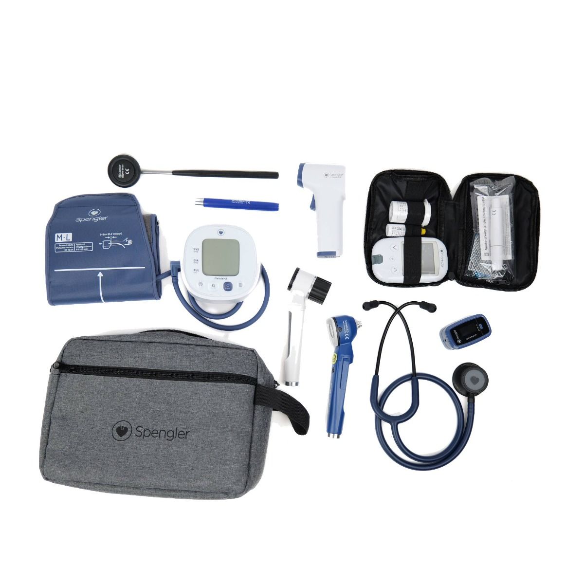 Il kit completo di diagnostica medica Spengler concentra l'esperienza e l'affidabilità del marchio in un insieme coerente di strumenti essenziali. Progettato per accompagnare gli esami clinici di routine e le situazioni di emergenza, riunisce dispositivi ad alte prestazioni che coprono l'intera gamma di procedure diagnostiche: controllo dei riflessi, auscultazione, misurazione della pressione sanguigna, della saturazione dell'ossigeno e della glicemia, misurazione della temperatura senza contatto, osservazione della pelle, ispezione del canale uditivo e illuminazione mirata.
