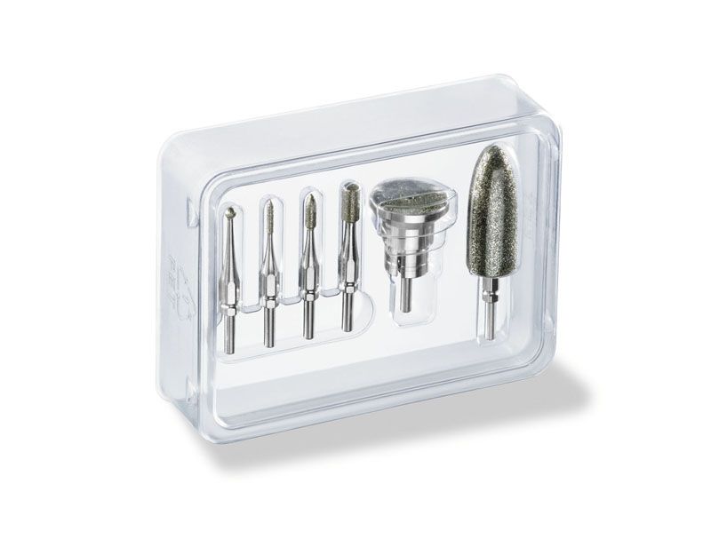 | - Il set può essere riposto nell'astuccio MP60 | - Fresa a cilindro: limatura e levigatura a grana grossa delle superfici indurite delle unghie dei piedi |