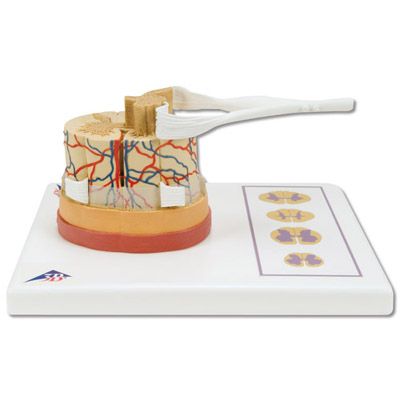 Il modello mostra la struttura del midollo osseo ingrandito ca. 5 volte. Il midollo osseo si compone della sostanza grigia che racchiude il canale ependimale e della sostanza bianca esterna. Sul piedistallo sono illustrate graficamente le diverse sezioni inerenti alla sostanza grigia e bianca del midollo cervicale, toracico, lombare e sacrale. Consegna su piedistallo.