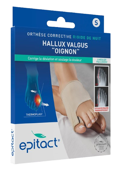 L'ortesi correttiva notturna per alluce valgo Epitact è progettata per supportare la correzione dell'alluce valgo e contribuire a limitare il peggioramento della deviazione dell'alluce. Utilizzata durante il sonno, agisce quando il piede è a riposo per fornire una correzione progressiva e ridurre il dolore articolare spesso associato a questa deformità. Contribuisce inoltre a ridurre il disagio causato dal contatto con le lenzuola, in particolare nella zona del "bunion".
