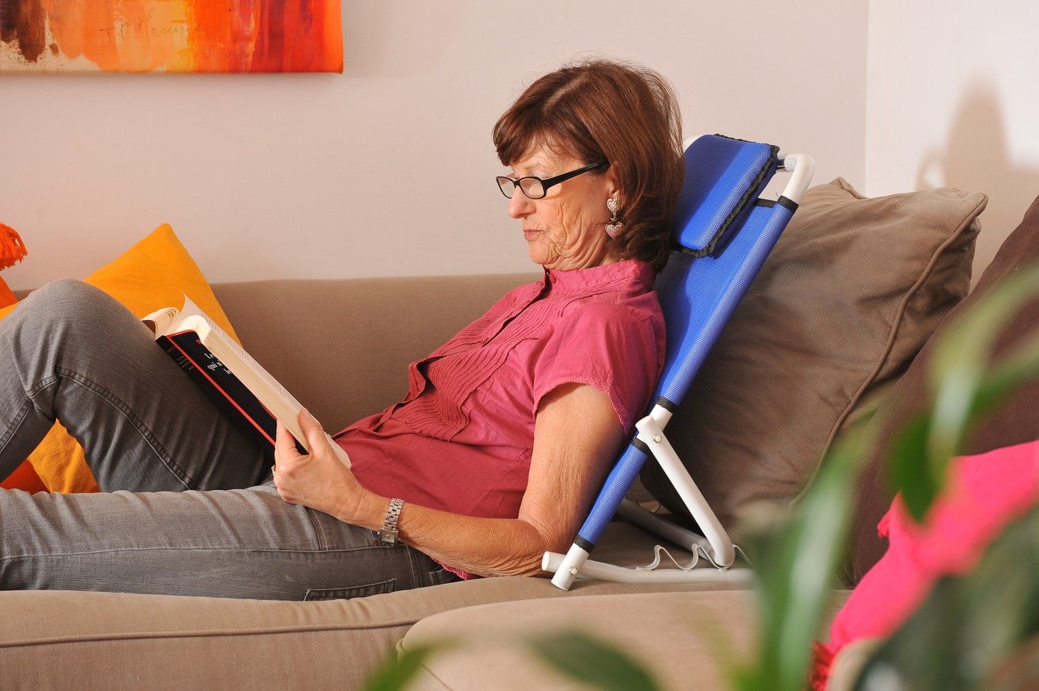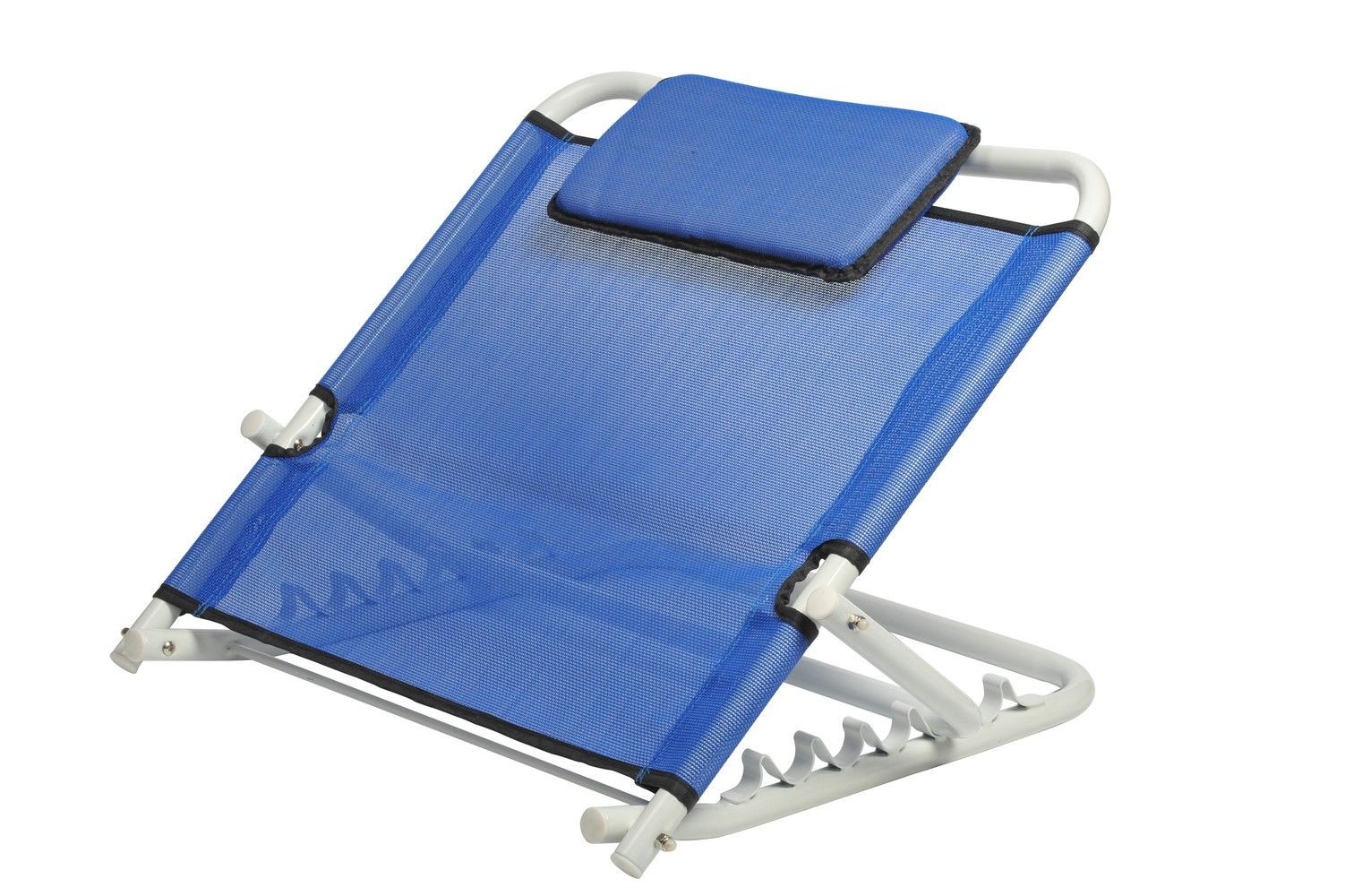 Lo Sostegno per la schiena regolabile - Holtex permette di sedersi comodamente in un letto. Struttura in tubo di acciaio, rivestito con resina epossidica bianca è inclinabile. Rivestimento nylon. Colore: blu. Dimensioni: 61 x 51 x 35-45 cm.